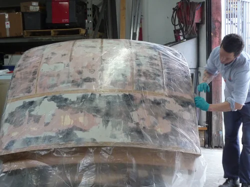A frame and substrate was needed for a mosaic by Summer Wheat. The piece was mounted above a fountain at an A. Quincy Jones house in Beverly Hills. We started with a small mock up and came up with a design from there. The main challenge was to make a large frame that could be removed if the artwork needed to be transported. The fasteners remained hidden behind the stand off detail.